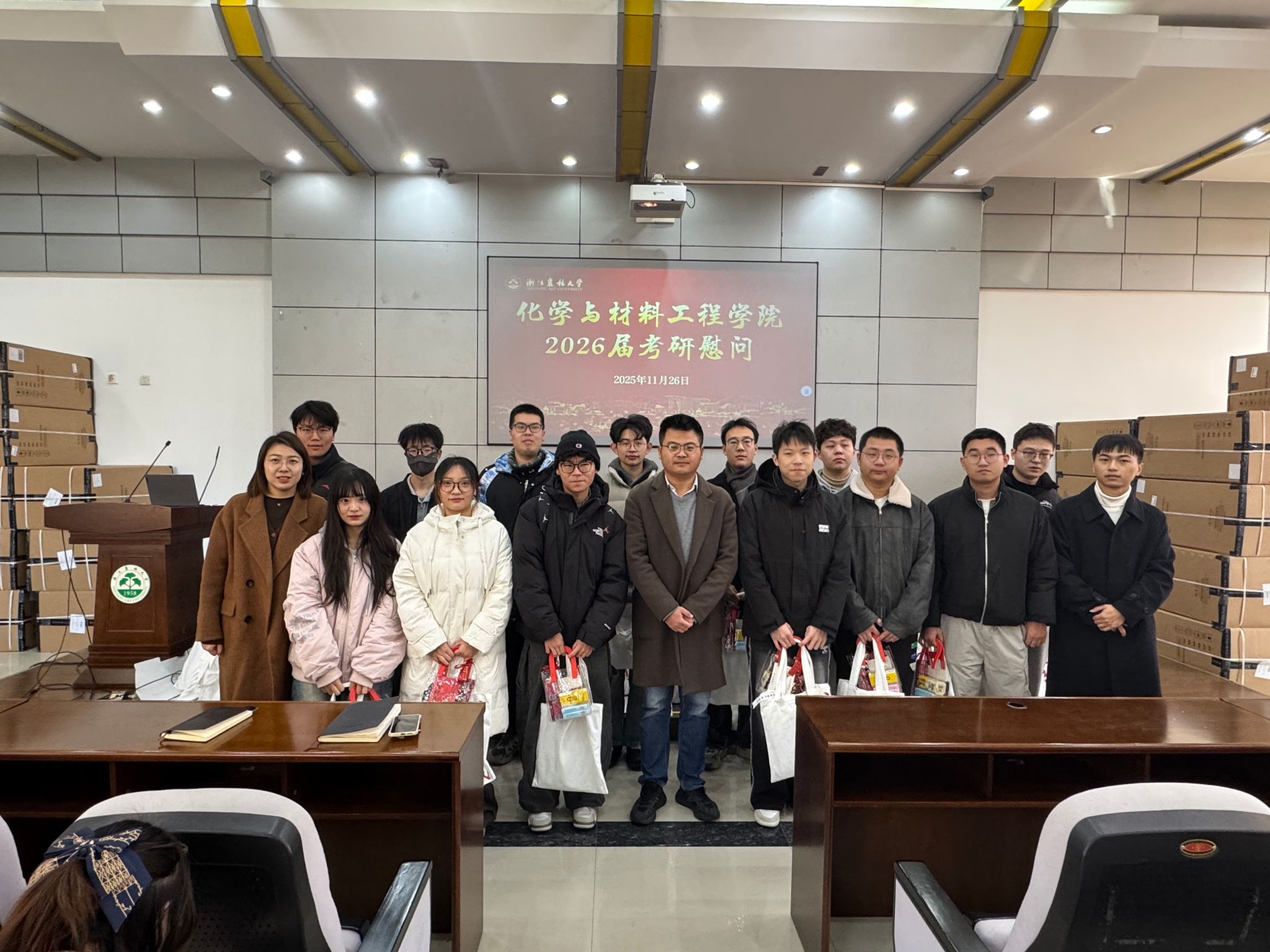 在2026年研究生招生考试即将到来之际,11月26日上午,化学与材料工程学院组织开展2026届学生考研慰问活动。学院学生工作负责人、学生办主任、辅导员出席活动并为学子们送上鼓励与祝福,现场还向备考学子发放了精心准备的考研慰问礼包。
