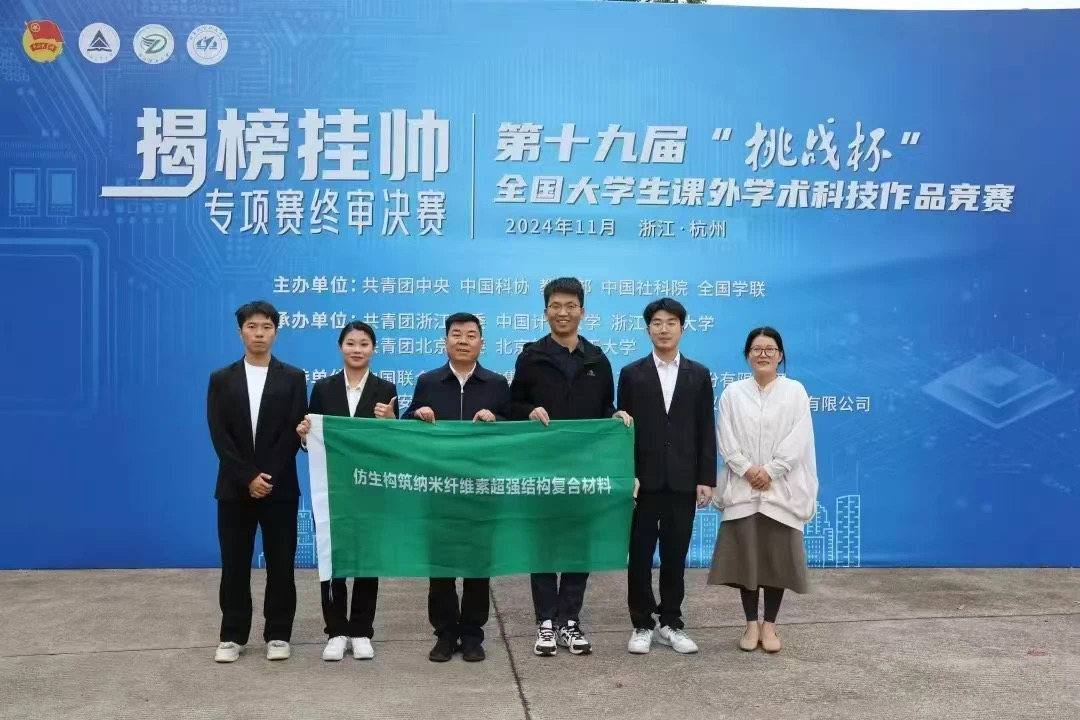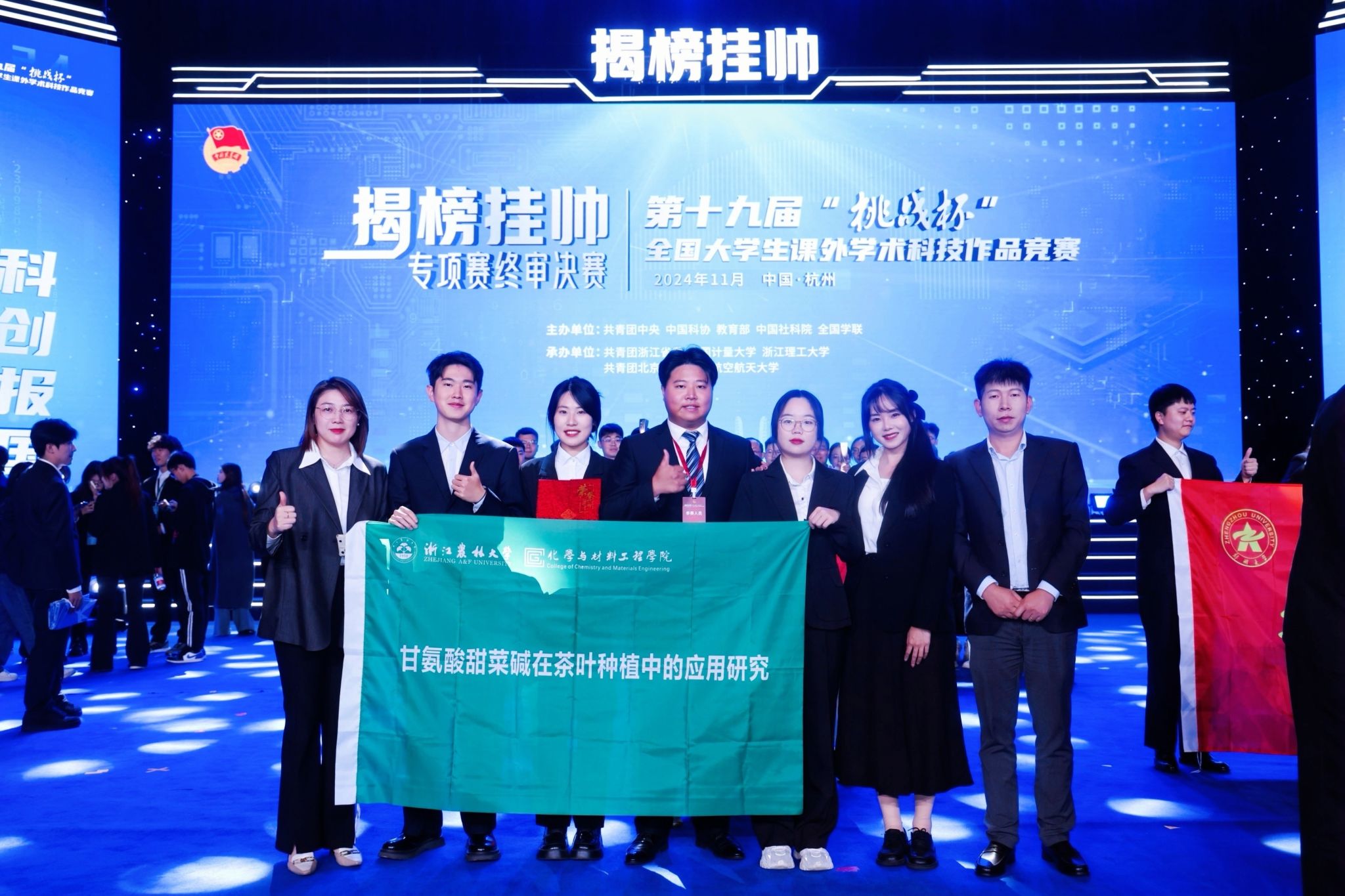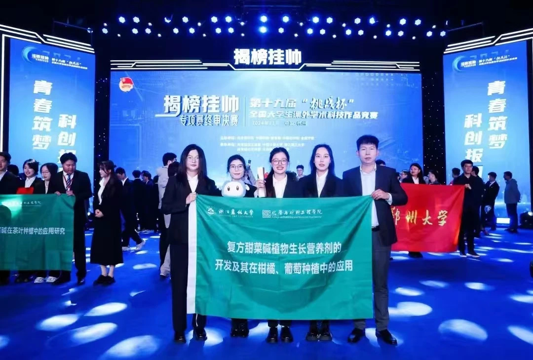 11月17日,第十九届“挑战杯”全国大学生课外学术科技作品竞赛2024年度“揭榜挂帅”专项赛终审决赛在中国计量大学、浙江理工大学落下帷幕。我院季馨雨等同学的项目《奇碱异能——复方甜菜碱植物生长营养剂的开发及其在柑橘、葡萄种植中的应用》获擂主(特等奖中得分第一),叶柔汐等同学的项目《甘氨酸甜菜碱在茶叶种植中的应用研究》获特等奖、尹开仁等同学的项目《仿生构筑纳米纤维素超强结构复合材料》获一等奖。