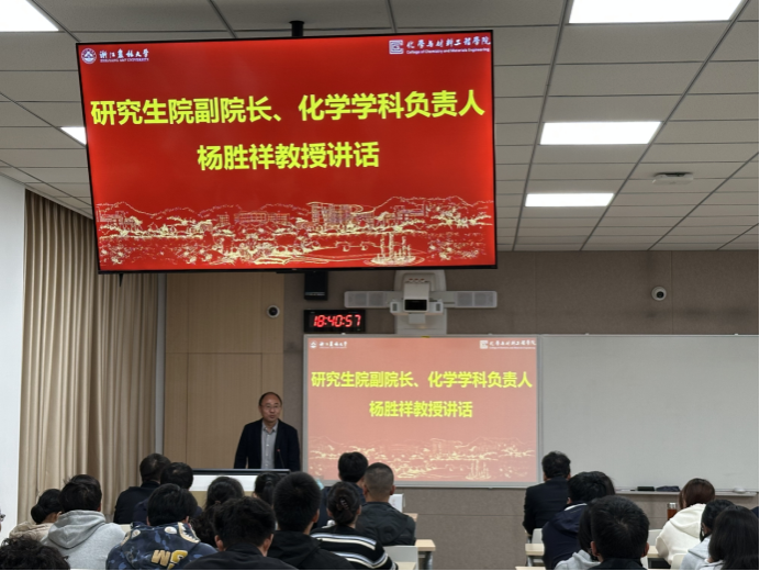 接着,研究生院副院长、化学学科负责人杨胜祥教授向同学们介绍了化学学科的发展历程、发展现状和人才培养成效,并提了三点要求:第一,希望同学们根据自身的专业特长和兴趣爱好尽早加入科研团队,边学习边开展科学研究活动,全面提升自己的理论和实践能力;第二,同学们切勿躺平,要时时刻刻勇往直前,为步入社会做好准备;第三,要传承父母对子女、老师对学生般无私的爱,并将这份发自内心的爱传递给身边的每一个人、每一件事,让自己在充满爱的“化学”大家庭中茁壮成长。
