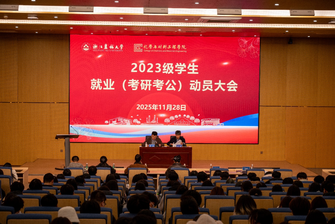 11月28日晚,化材学院2023级学生就业(考研考公)动员大会在新农科交叉中心一楼报告厅举行。学院各年级辅导员以及2023级全体学生参加了本次大会。会议由学院党委副书记蒋超主持。