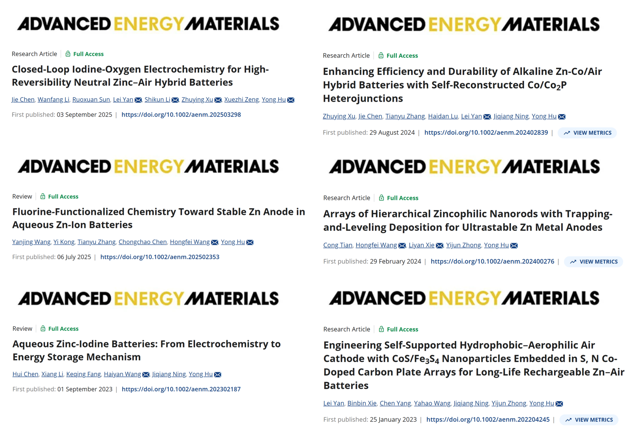 此外,胡勇教授团队基于在水系锌基电池领域的长期研究积累,近两年已经在Advanced Energy Materials上连续发表了多篇论文(Adv. Energy Mater. 2025, e03298;Adv. Energy Mater. 2025, 15, 2402839;Adv. Energy Mater. 2025, 2502353;Adv. Energy Mater. 2024, 14, 2400276;Adv. Energy Mater. 2023, 13, 2302187;Adv. Energy Mater. 2023, 13, 2204245)。这六篇论文分别介绍了一种中性水系锌空气/碘化物混合电池(ZAIB)的闭环碘氧循环机制;介绍了由紧密排列的Co/Co2P异质结构生长在P/N共掺杂碳纳米纤维的“中心茎”上的“谷粒”组成的麦穗状阴极的合成方法;总结讨论了含氟材料在电解质成分(如锌盐、添加剂和共溶剂)中的结构特征及其在AZIBs特定区域的作用机制;介绍了在泡沫铜上排列的核壳纳米棒阵列来稳定锌阳极的策略;综述了应对锌碘电池在正极、负极、电解质和隔膜方面挑战的具体策略以及介绍了一种疏水亲氧策略,以硫、氮共掺杂碳板阵列(CoS/Fe3S4@SNCP)封装的CoS/Fe3S4纳米颗粒为基础,制备了自支撑空气阴极。这些工作为该领域的发展提供了系统参考与理论支撑,推动了水系锌基电池从基础研究走向实际应用的进程。